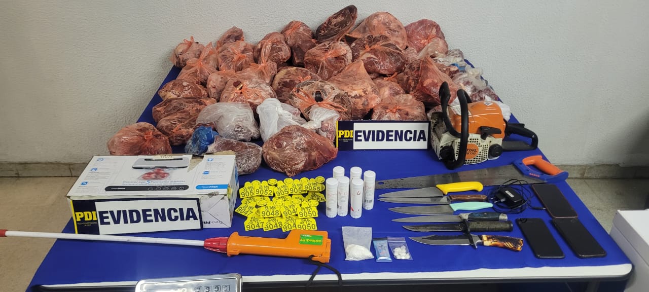 En el procedimiento policial se allanaron nueve viviendas donde fueron incautados: 41, 92 gramos de clorhidrato de cocaína, dinero en efectivo, equipos móviles, una motosierra, una pesa digital, una máquina selladora al vacío, elementos para el faenamiento de animales, un camión ¾ ganadero -avaluado en 15 millones de pesos-, 111 kilos 700 grs. de carne de vacuno trozada y dosificada – avaluada en un millón 300 mil pesos, además de siete animales- avaluados en 9 millones de pesos.