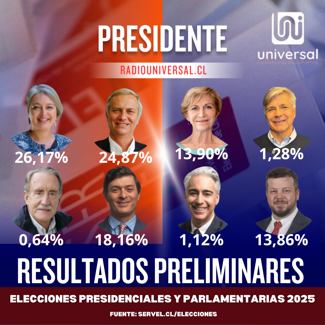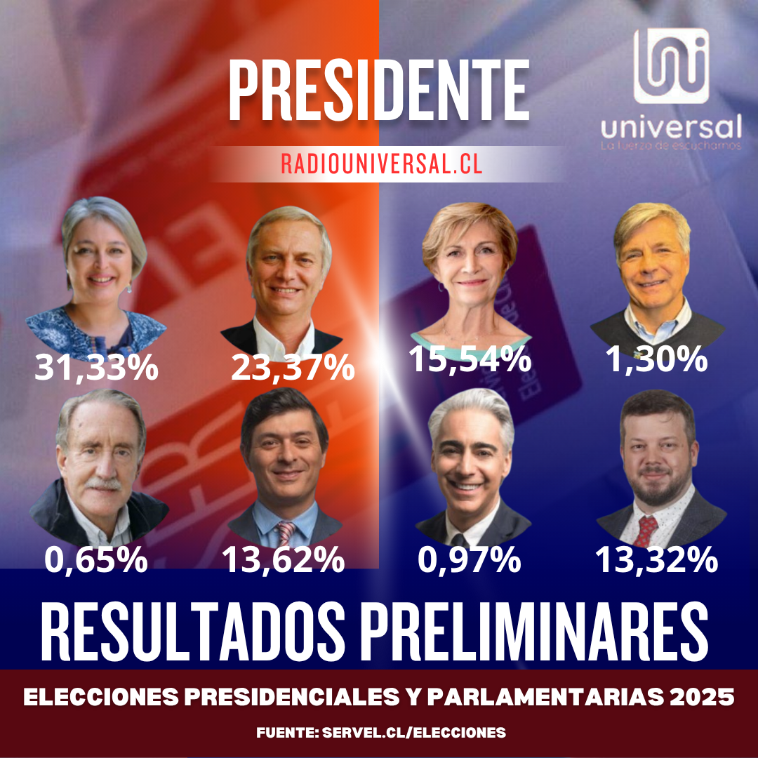 20:45 PM- Nuevo Cómputo Servel, Jeannette Jara continúa en el primer lugar con un 26,67%, José Antonio Kast le sigue con un 24,19%. Preliminarmente son ellos los candidatos para la segunda vuelta.