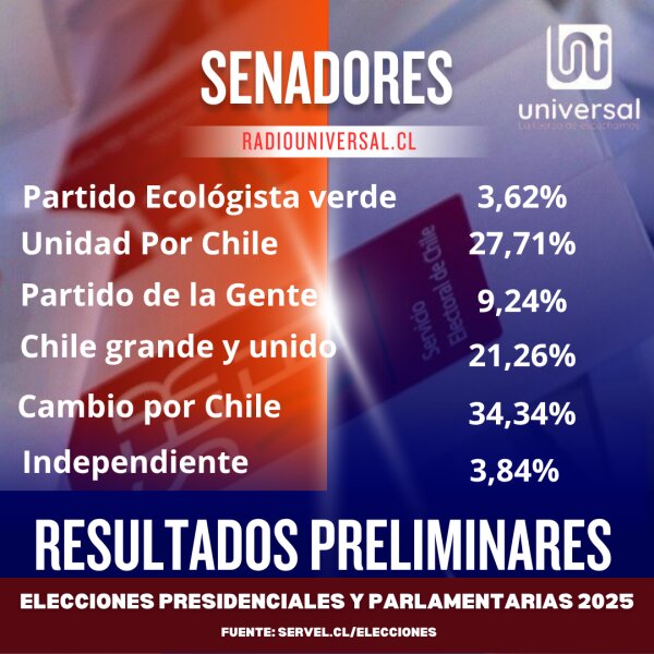20:05 PM- Cómputo preliminar de listas para senadores en La Araucanía: Según los primeros resultados del Servel, la lista Cambio por Chile lidera la votación regional con un 34,34%, seguida por Unidad por Chile, que obtiene un 27,71%. Más atrás se posicionan Chile grande y unido con un 21,26%, el Partido de la Gente con un 9,24%, el Partido Ecologista Verde con un 3,62%, y las candidaturas independientes con un 3,84%. Los datos siguen siendo preliminares y podrían variar conforme avance el conteo oficial.