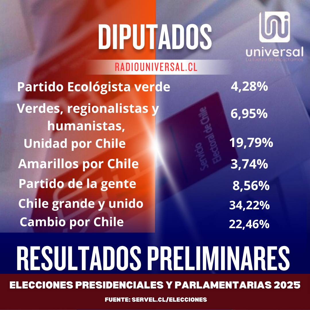 20:19 PM- Cómputo preliminar de diputados en La Araucanía: Según los primeros datos entregados por el Servel, la lista Chile Grande y Unido lidera la votación regional con un 34,22%, seguida por Cambio por Chile, que alcanza un 22,46%. Más atrás se ubican Unidad por Chile con un 19,79%, el Partido de la Gente con un 8,56%, Verdes, Regionalistas y Humanistas con un 6,95%, el Partido Ecologista Verde con un 4,28%, y Amarillos por Chile con un 3,74%. Estos resultados siguen siendo preliminares y podrían variar en las próximas actualizaciones oficiales.